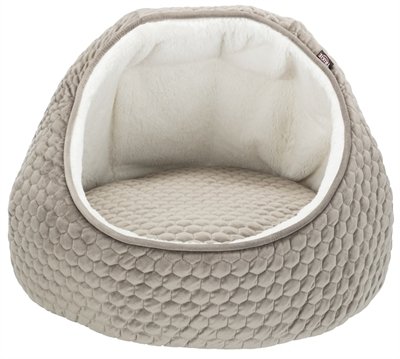De Trixie Kattenmand Iglo Livia Grijs / Creme 55 x 55 x 45 cm is een knusse kattenmand in velourslook met pluche binnenkant en wendbaar kussen. In deze mand voelt jouw kat zich heerlijk veilig! Door de ronde vorm is jouw kat aan bijna alle kanten beschermd en kan hij comfortabel tegen de hoge randen aanliggen. De buitenkant van het mandje is uitgevoerd in een leuke velours look en het kattenbed heeft een binnenkant met doorgestikte pluche bekleding. Door de polyestervlies en schuimrubber vulling ligt jouw kat stevig en de slipvaste onderkant zorgt dat jouw dier gemakkelijk in en uit de mand kan stappen. Het leuke kussen is bovendien wendbaar en heeft twee verschillende designs&#44